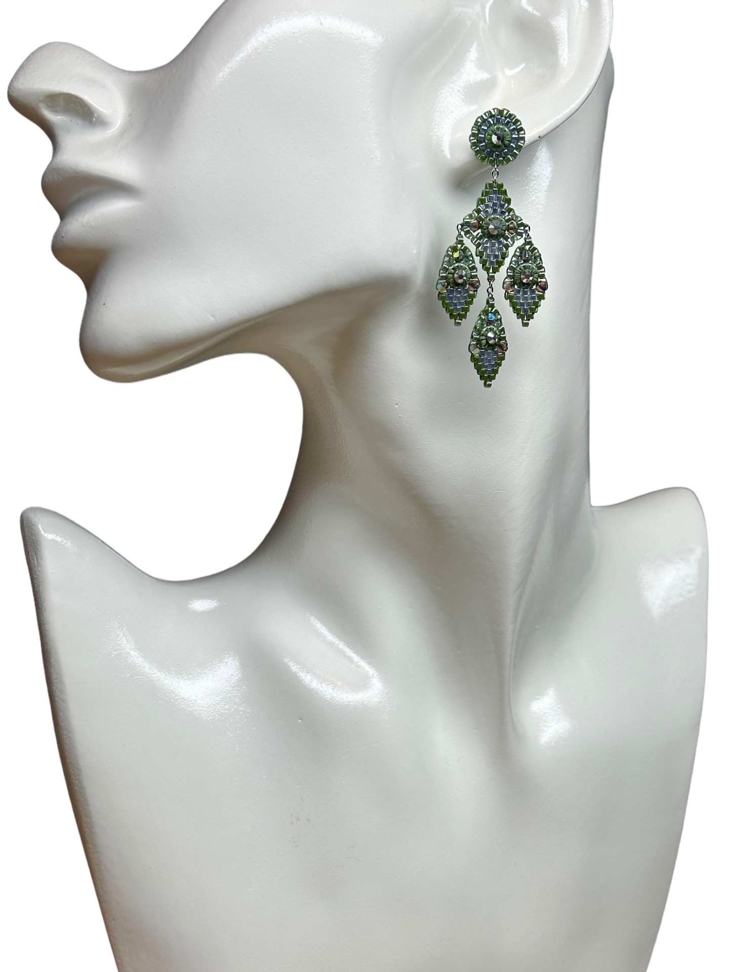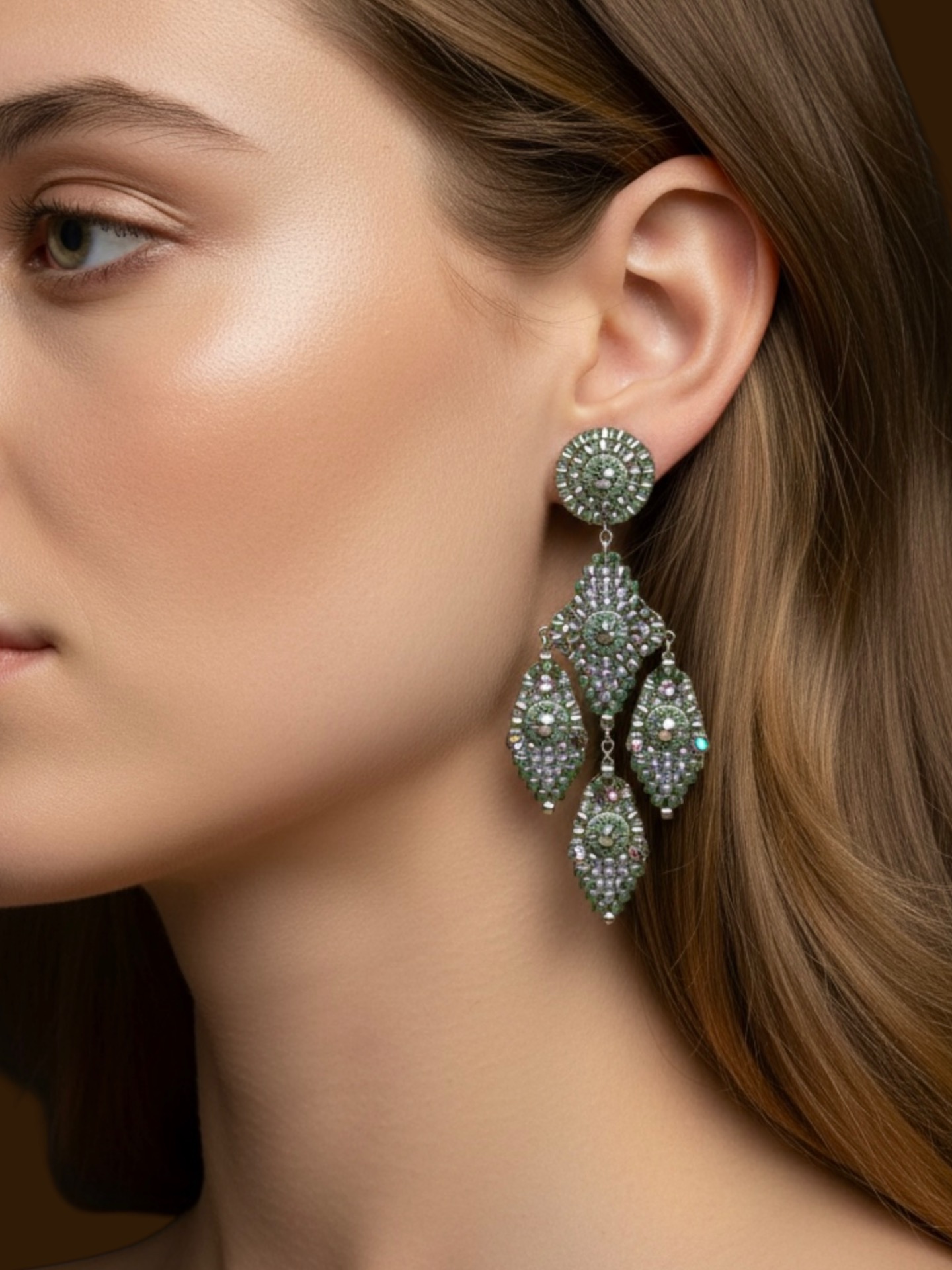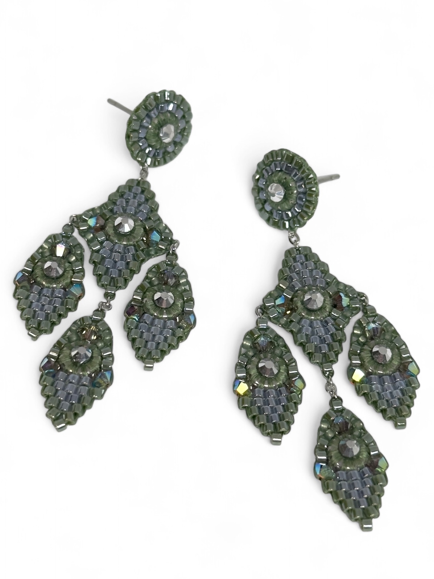 Material: Edelstahl, Silikon-Ohrringverschlüsse (10 mm Ø), Facettierte Glasperlen, Miyuki Perlen, Strasssteine