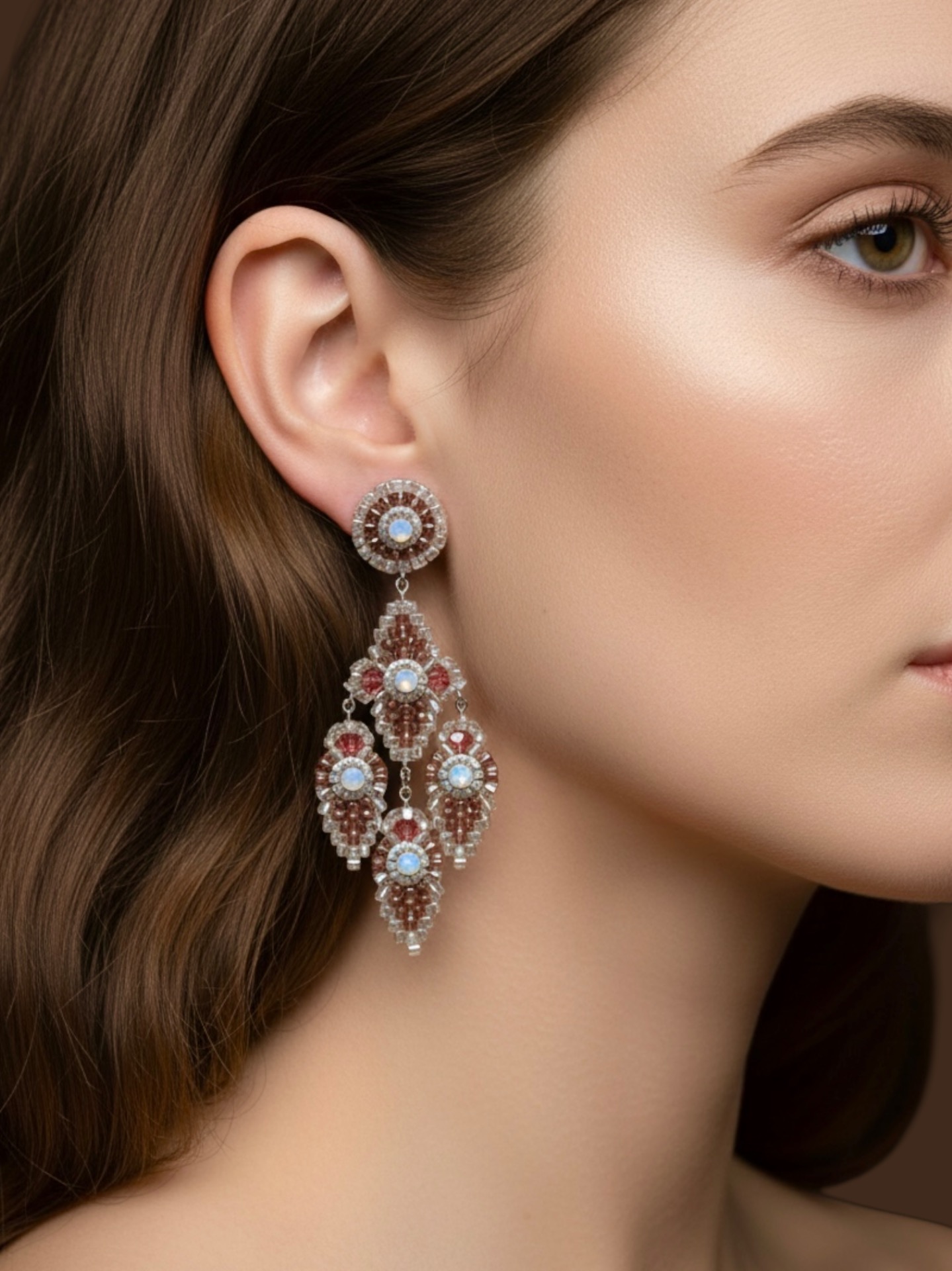 Material: Edelstahl, Silikon-Ohrringverschlüsse (10 mm Ø), Facettierte Glasperlen, Miyuki Perlen, Strasssteine