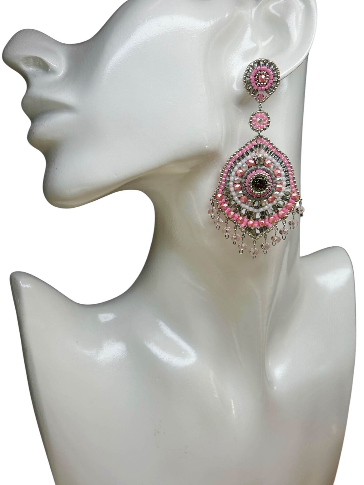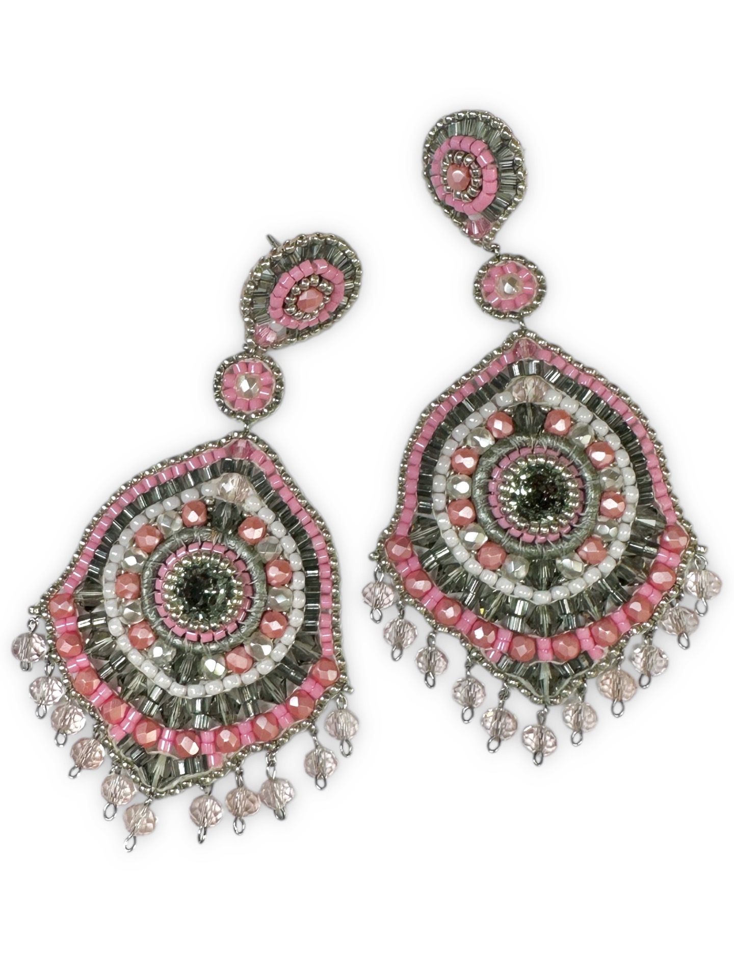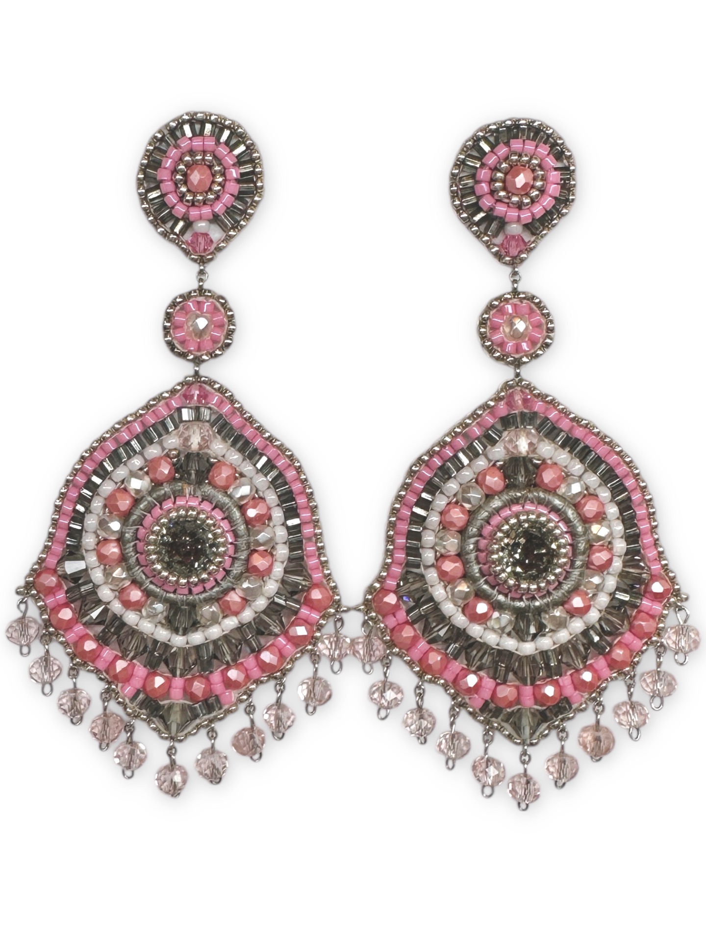 Material: Edelstahl, Silikon-Ohrringverschlüsse (10 mm Ø), Miyuki/Toho Perlen, Facettierte Glasperlen, Lederband, Strasssteine